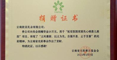 4月29日,云南省工商聯(lián)、云南省光彩事業(yè)基金會組織了向昆明市延安醫(yī)院“救助先天性心臟病困難患兒項目”捐贈儀式,大理州企業(yè)家協(xié)會理事單位——歐亞乳業(yè)參加儀式并捐款20萬元用于患兒的救助。少年兒童是祖國的未來、民族的希望,歐亞乳業(yè)成立21年來,以捐資助學為主積極投身社會公益事業(yè),累計捐款2000余萬元,切實為貧困地區(qū)學校改善教學和生活環(huán)境提供支持,助力莘莘學子逐夢前行,不負寒窗,先后被大理州扶貧辦評為“扶貧助學愛心企業(yè)”,被大理州工商聯(lián)、大理州光彩事業(yè)促進會評為“光彩事業(yè)先進單位”,被大理市委、市政府評為“捐