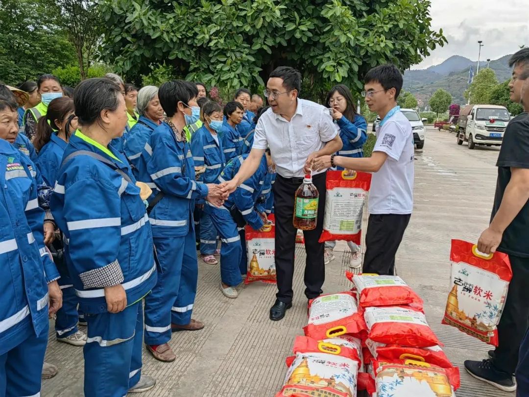 為一線環(huán)衛(wèi)工人發(fā)放大米、食用油等慰問物品。