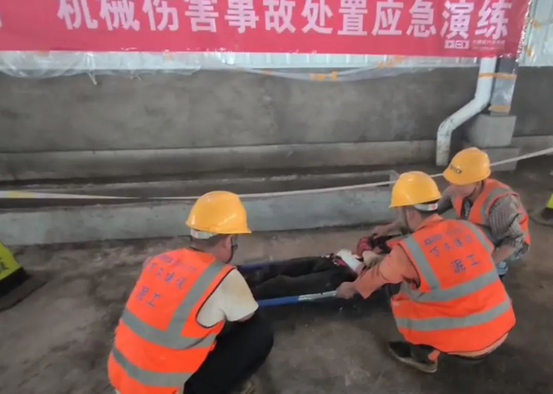 應急演練前,由項目經理進行演練前動員,并強調各參演人員要按照演練方案有序地開展演練工作。演練過程中,由安全負責人進行機械傷害知識和應急救援知識講解,演練模擬了工人在使用切割機下料時造成機械傷害事故,項目部迅速啟動應急救援預案,迅速組織相關救援力量實施救援,在最短時間內充分發(fā)揮安全保障機制作用,有效減少人員傷亡和維護施工作業(yè)人員生命安全。