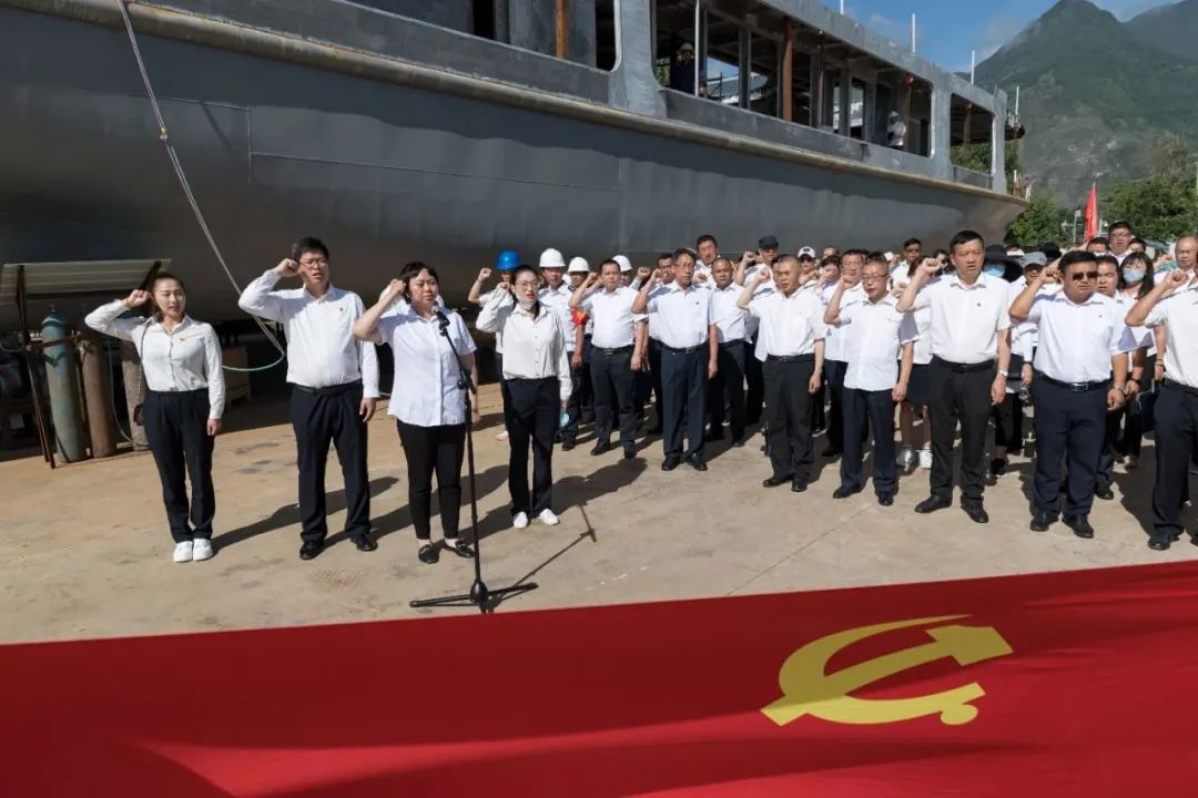 公司黨委創(chuàng)新活動形式,將宣誓地點(diǎn)定在桃源碼頭268客位新能源船舶更新建造項(xiàng)目上。今年新入黨的預(yù)備黨員在洱海畔面向黨旗莊嚴(yán)宣誓,公司黨委委員、副總經(jīng)理陶婷同志領(lǐng)誓,在場的全體黨員共同重溫了入黨誓詞。宣誓結(jié)束后,參加活動的全體人員共同參與了268客位新能源船舶更新建造項(xiàng)目的調(diào)研。