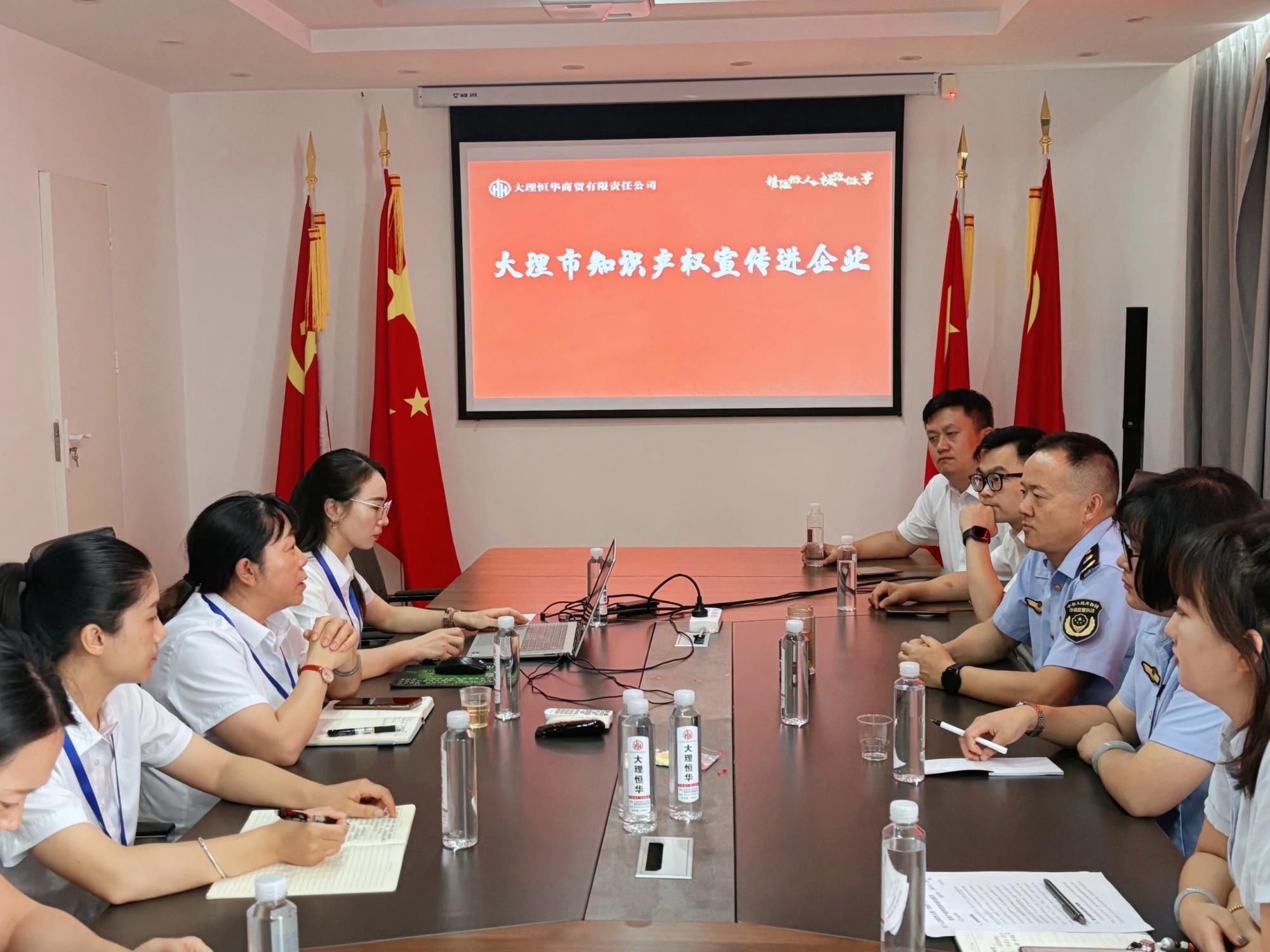 為充分發(fā)揮企業(yè)知識產(chǎn)權(quán)優(yōu)勢,推動企業(yè)以合法擁有的專利權(quán)、商標權(quán)等知識產(chǎn)權(quán)作為質(zhì)押標的獲取金融機構(gòu)貸款,切實破解融資難題,7月24日,大理市市場監(jiān)督管理局聯(lián)合曲靖市商業(yè)銀行大理分行、恒豐銀行大理分行組成專項服務團隊,走進大理州企業(yè)家協(xié)會副會長單位——大理恒華商貿(mào)有限責任公司開展“大理市知識產(chǎn)權(quán)宣傳進企業(yè)”活動,與公司相關(guān)負責人進行面對面地溝通交流。