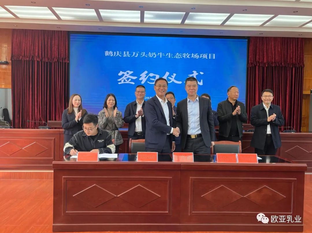 為加快綠色奶源基地建設,提高優(yōu)質(zhì)原料奶供應量,大理州企業(yè)家協(xié)會理事單位——云南歐亞乳業(yè)有限公司繼2015年在鶴慶縣金墩鄉(xiāng)北溪村投資建設萬頭國家級奶牛標準化示范場后,11月8日,又與鶴慶縣政府簽定投資協(xié)議,新建一個存欄11000頭娟姍奶牛的有機生態(tài)牧場。大理州政府黨組成員、一級巡視員吉向陽,鶴慶縣四班子領導,縣級相關部門負責人等領導出席儀式,歐亞乳業(yè)公司董事長彭金國及管理人員參加儀式。
