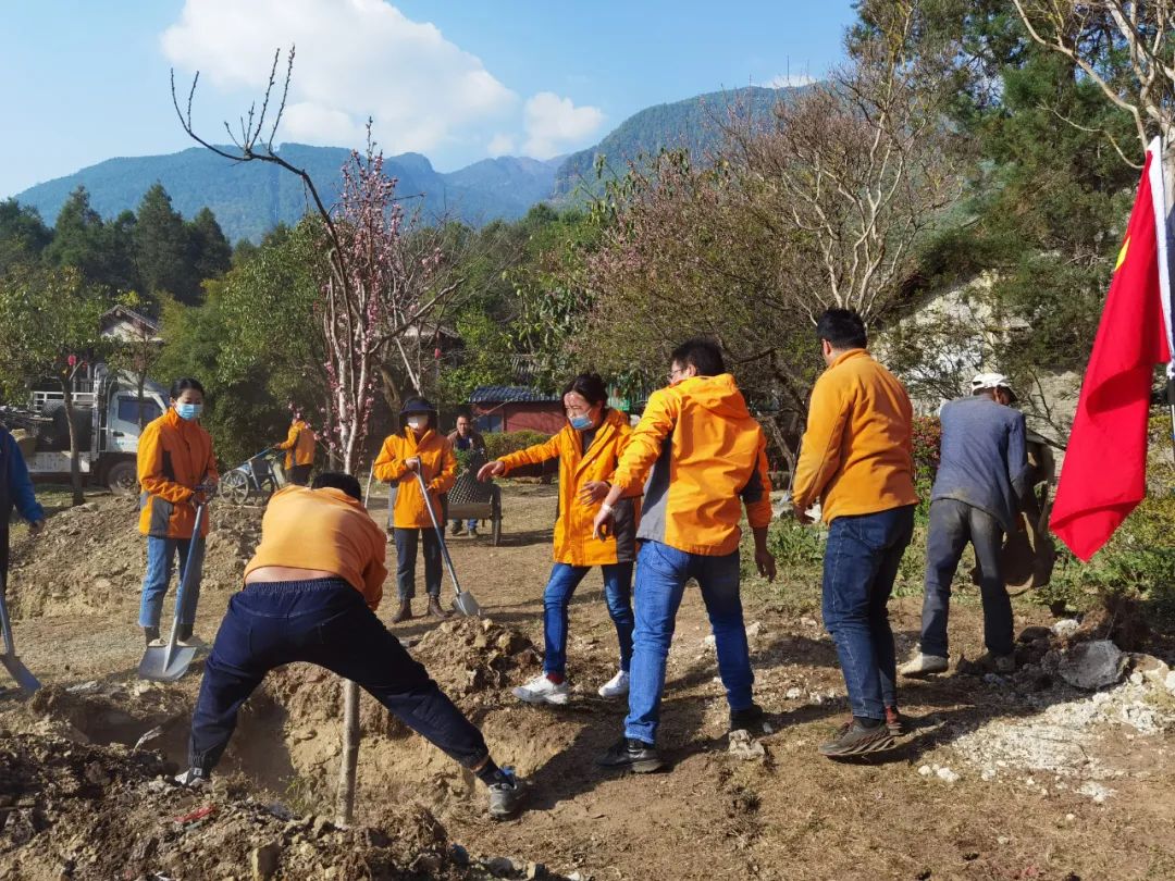 在大家共同努力下,40棵桃樹全部種植完成。有的同志手上磨出了血泡、有的同志累得直不起腰、抬不動胳膊,大家沒有一句怨言,看著這一片桃林,嘴角洋溢出了欣慰的笑容。放眼望去,一棵棵樹苗錯落有致、迎風(fēng)挺立,陽光下一片初生的桃林迎風(fēng)招展,煥發(fā)盎然生機(jī)。